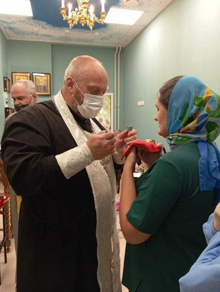 На соборную молитву пришло 12 человек (5 детей в сопровождении 7 взрослых). После краткого богослужения отцы причастили 8 человек (6 детей, 2 взрослых);