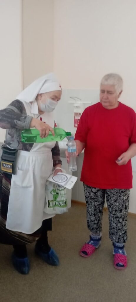 Сёстры милосердия служили в Республиканском клиническом онкологическом диспансере. Обошли оба корпуса диспансера с Крещенской водой. Всем желающим добавляли агиасму в подготовленные бутылки с водой. Кроме того, раздавали буклеты праздника «Богоявление. Крещение Господне» и наклейки с молитвой на принятие просфоры и святой воды.