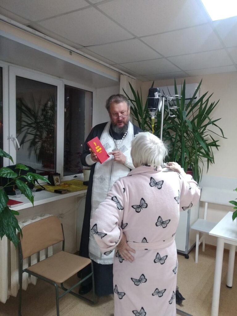В субботу, 7 декабря, пациенты Республиканского клинического онкологического диспансера получили еженедельную возможность приобщиться Святых Христовых Тайн. Накануне, в пятницу, требные сёстры милосердия обошли корпуса РКОД, чтобы оповестить о субботнем молебне.
