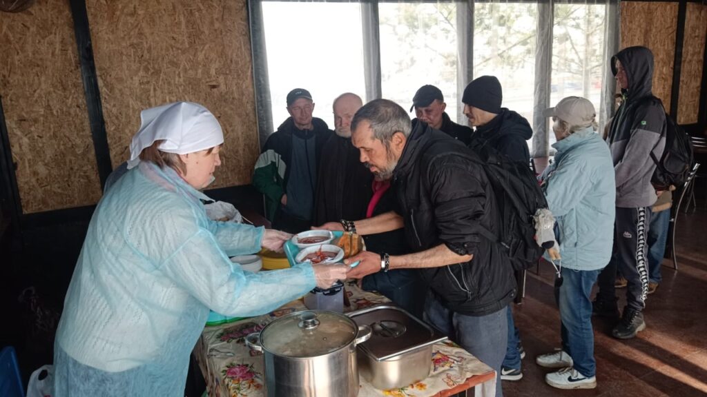 — кормили бездомных в кафе «Берег+» в Сипайлово. Обед состоял из салата, борща, овсяной каши с котлетой, чая со сгущённым молоком, печенья и конфет. На помин души воина Алексия раздали пирожки. Дали людям с собой варёные яйца и излишки обеда. Накормили во Славу Божию 17 человек.