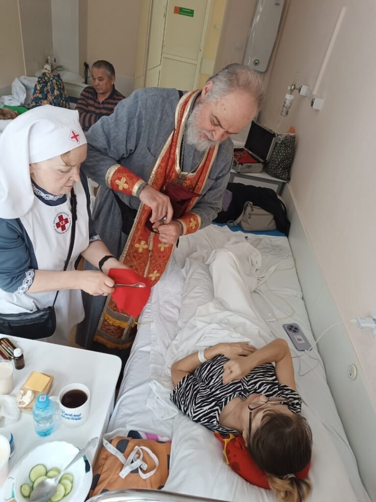 На прошедшей неделе сёстры милосердия продолжали нести служение в паллиативном отделении Республиканского клинического онкологического диспансера. Служение проходило в будние дни. Во вторник 6 мая настоятель храма святого преподобного Серафима Саровского с. Русский Юрмаш протоиерей Сергий Бакланов провёл в отделении молебен о здравии и совершил несколько Таинств: исповедовал 5 человек, причастил 4 человека, соборовал 2 человека. Наша сестра помогала батюшке.