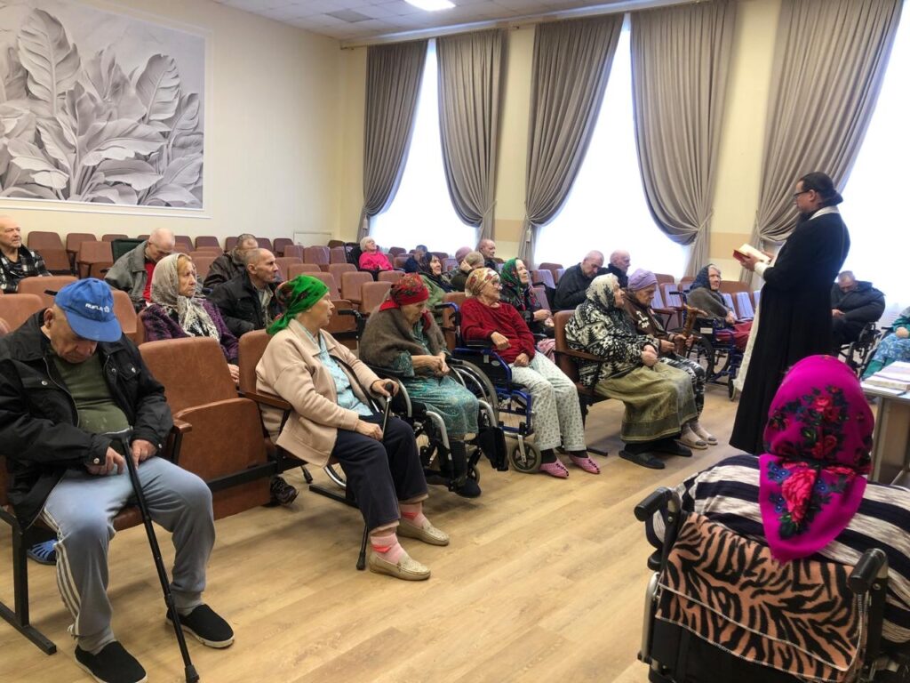 — в геронтологическом центре «Именлек» служили 4 члена сестричества милосердия и 1 доброволец. Как обычно, в начале служения помогали в кормлении обедом немощных жителей. Затем помогли маломобильным насельникам добраться в актовый зал на богослужение. На общую молитву собралось 34 человека. Клирик кафедрального собора Рождества Пресвятой Богородицы г. Уфы иерей Алексий Словоохотов отслужил молебен о здравии и литию, окропил всех присутствовавших святой водой. После молебна общались с жителями в комнатах, помогали им в быту;