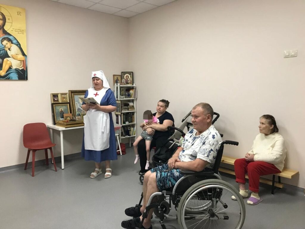 На прошедшей неделе по будням продолжалось служение сестёр милосердия и добровольцев сестричества в паллиативном отделении Республиканского клинического онкологического диспансера. Во вторник 15 июля отделение посетил настоятель храма святого преподобного Серафима Саровского с. Русский Юрмаш протоиерей Сергий Бакланов. Он отслужил молебен о здравии, по окончании которого причастил 7 пациентов. О. Сергию помогала сестра милосердия.