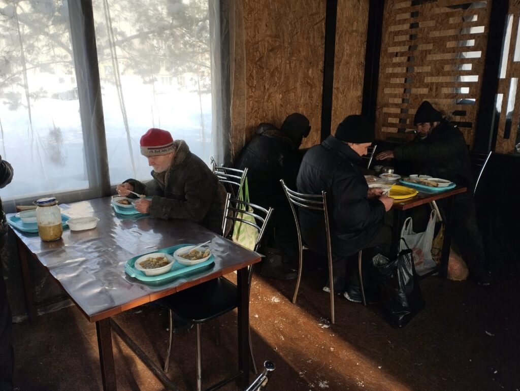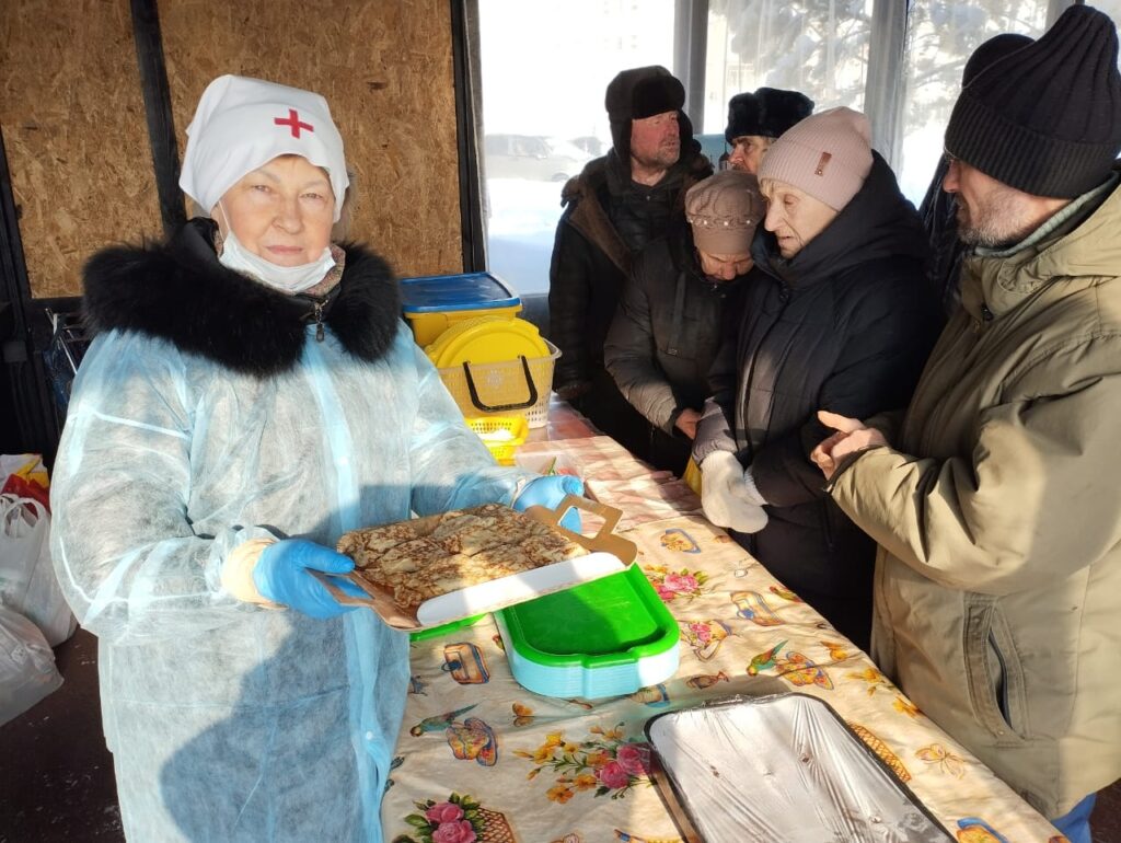 — в кафе «Берег+» раздавали благотворительный обед бездомным и малоимущим. На первое был суп с тушёнкой и рисом, на второе — гречневая каша с котлетами и икрой из кабачков, на третье — чай с маффинами. В честь праздника угощали подопечных пирожными.