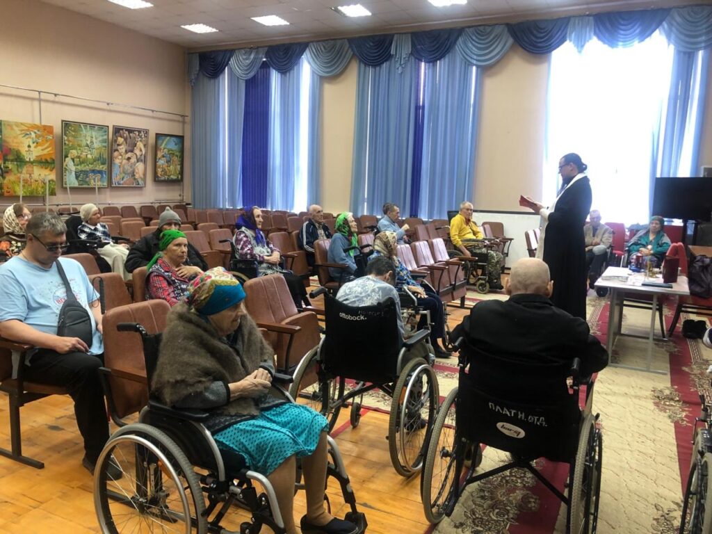 — в геронтологическом центре «Именлек» начали своё служение, как обычно, с кормления во время обеда лежачих жителей. Затем помогли людям, которые испытывают трудности с передвижением, собраться в актовом зале на богослужение. Клирик кафедрального собора Рождества Пресвятой Богородицы иерей Алексий Словоохотов отслужил молебен о здравии и литию. На соборной молитве было 25 человек. Далее гуляли с теми, кто пожелал, общались, сходили в аптеку за лекарствами. Нашим брату и сёстрам милосердия помогали 3 добровольца;