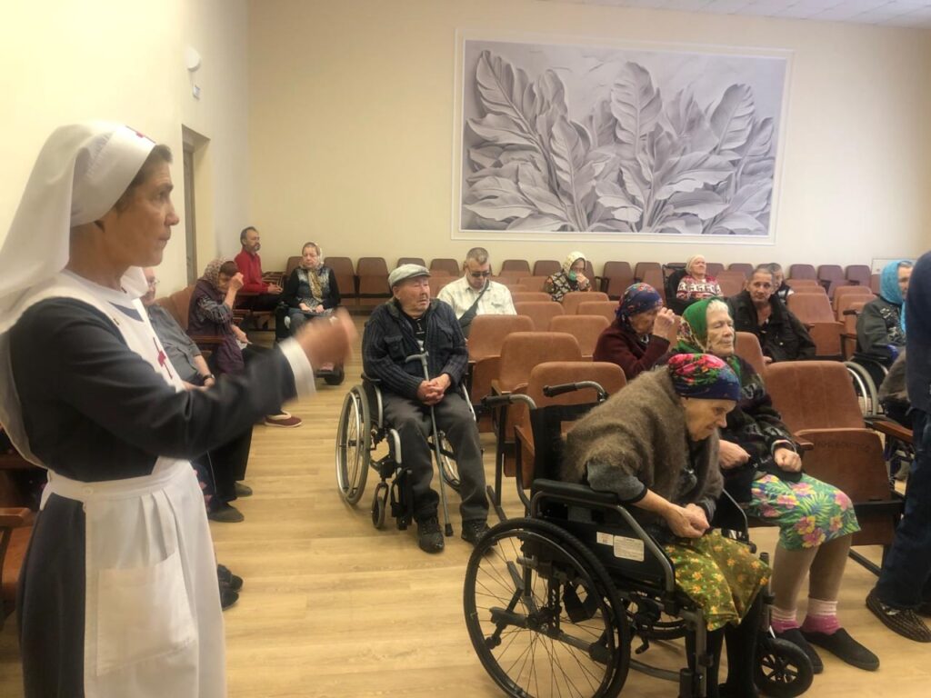 — в геронтологическом центре «Именлек» служили 4 члена сестричества милосердия и 1 доброволец. Началось служение, как обычно, с кормления обедом немощных жителей. После обеда помогли тем, кому трудно перемещаться самостоятельно, добраться в актовый зал на соборную молитву. Клирик Свято-Сергиевского собора г. Уфы иерей Димитрий Назаров совершил молебен о здравии и литию, окропил всех святой водой, все приложились ко Кресту.